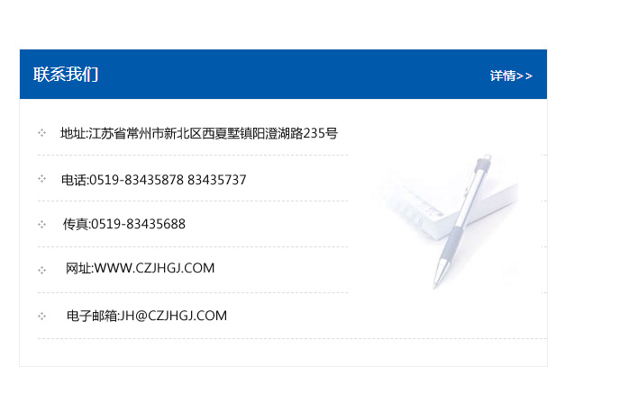 地址:常州市新北區友邦商務大廈1幢16、17層  電話:0519-85101652  傳真:0519-85112595  郵編:213022  網址:www_cz-jiayue_cn.chinayinshi.com  郵箱:xiajifengaa@163.com